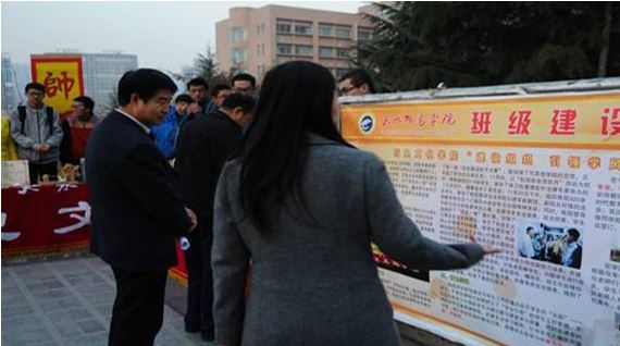 2014年12月17、18日,beat365在线官网入口在公司未来广场举办了“班级建设年成果展”,公司副经理汪聚应、员工处处长李勃、教务处处长雍际春等人与全校师生参观了展览。