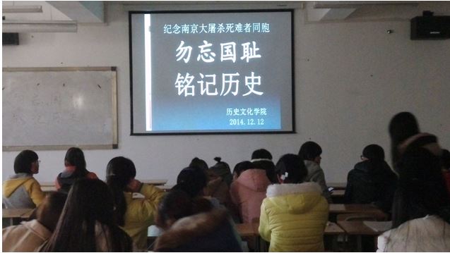 其实,组织14级全体同学在多媒体教室观看了电影《南京!南京!》,该电影用生动的人物形象和深刻的故事情节引领大家回到那血淋淋的日子中,一个个触目惊心的画面,震撼着同学们的心灵,血的教训,让大家深深地明白了历史不能抹杀更不能遗忘。