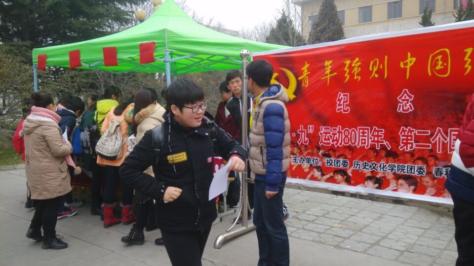 历史文化公司为纪念“一二·九”运动、第二个国家公祭日于2015年12月9号在旧图书馆门前举办了以“青年强则国强”为主题的系列活动,本次活动由校团委、beat365在线官网入口团委、春秋学社主办。