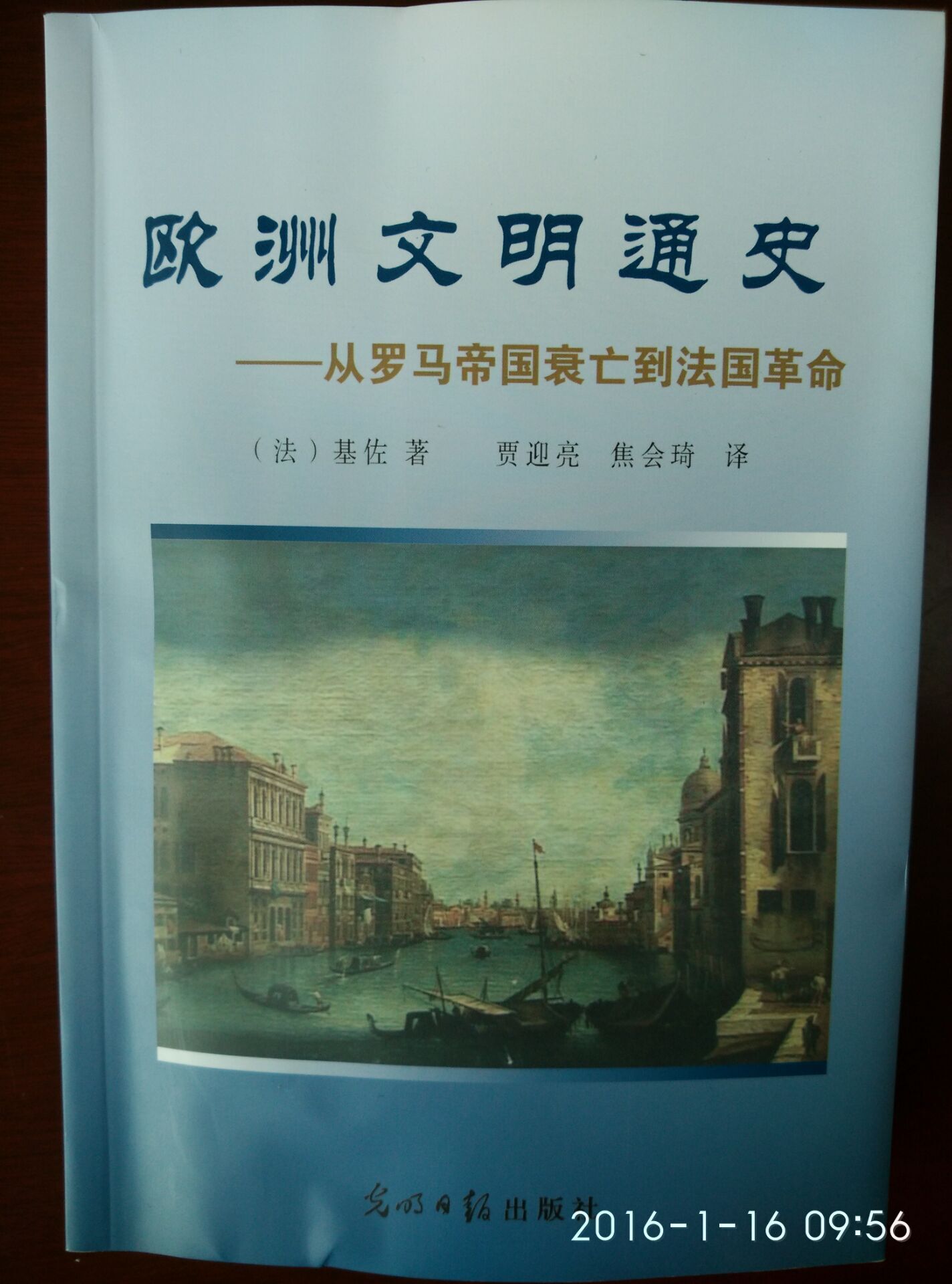 2015年10月,贾迎亮博士译著《欧洲文明通史》一书由光明日报出版社出版发行。该书原作者为法国19世纪中期著名的历史学家和政治家,他深受启蒙运动理性主义的影响,是继伏尔泰之后又一位文明史研究的开拓者。《欧洲文明通史》是他的代表作。在这本书中基佐认为文明就是社会的发展和人性的发展,因为罗马帝国衰亡后的欧洲社会具有多样性的特征,所以只有欧洲才有社会的发展和人性的发展。而在欧洲以外的社会中单一性原则占统治地位,所以谈不上存在文明。据此他提出了惊人的论断:欧洲之外无文明!任何形式的绝对权力必会扼杀社会的多样性,从而使文明趋于衰落。虽然基佐的欧洲中心论已在我国学界受到普遍批判,但他提出的社会的多样性与文明发展之间的关系依然是学界热议的问题,因此《欧洲文明通史》成为文明史研究的经典之作。