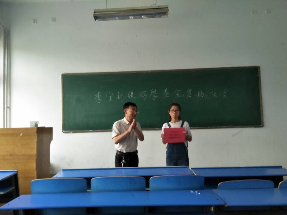 2018年6月21日上午9:30,在beat365在线官网入口二号教学楼103教室,公司举行了由安徽铜陵党校李宁先生为公司考研学子资助的1000元“新疆游学基金”的资助仪式。根据李宁先生的资助意向,受助对象为公司2018年考取新疆师范大学研究生的2014级员工郭蕾蕾。
