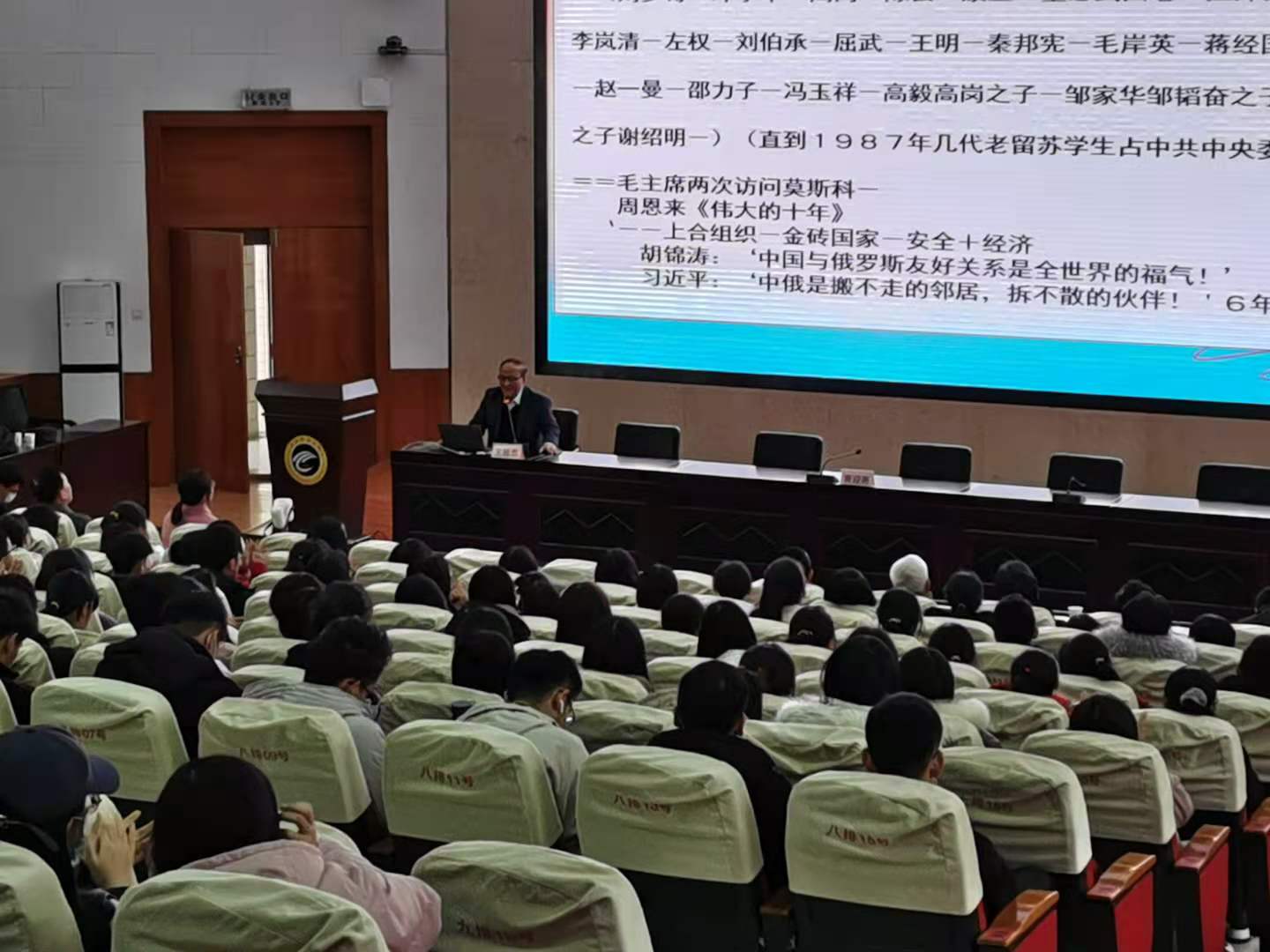 王教授首先以“近百年对中国影响最大”等几个主题词解读了研究和学习俄罗斯历史的重要性和必要性;接着从俄罗斯在历史上对世界文明发展的贡献、俄罗斯当今的自然资源、俄罗斯的经济发展潜力、俄罗斯的军事实力等几个方面论述了俄罗斯未来的大国强国地位,最后从中俄两国战略目标相近、战略利益相同、战略理念一致、战略困境相同、战略合作空间大等几个方面深度剖析了中俄关系的现状与发展趋势。报告过程中,王教授不但以深厚的专业水平教人,还以马克思主义的价值观念育人,更以一曲老腔老调、直功直令的秦腔弘扬中华优秀传统文化、以文化人,集学术报告、价值观引导和爱国主义教育为一体。