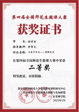 公司历史学专业20级1班员工汤祥亚、20级2班员工付潭舟,在第四届全国师范生微课大赛中均获二等奖。这是公司第三次参加该赛事,共计10名同学获奖。