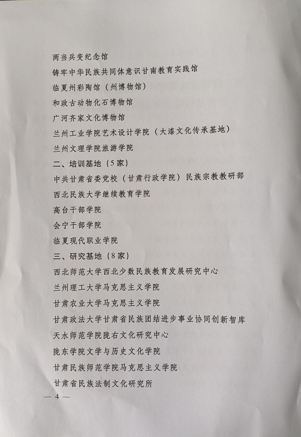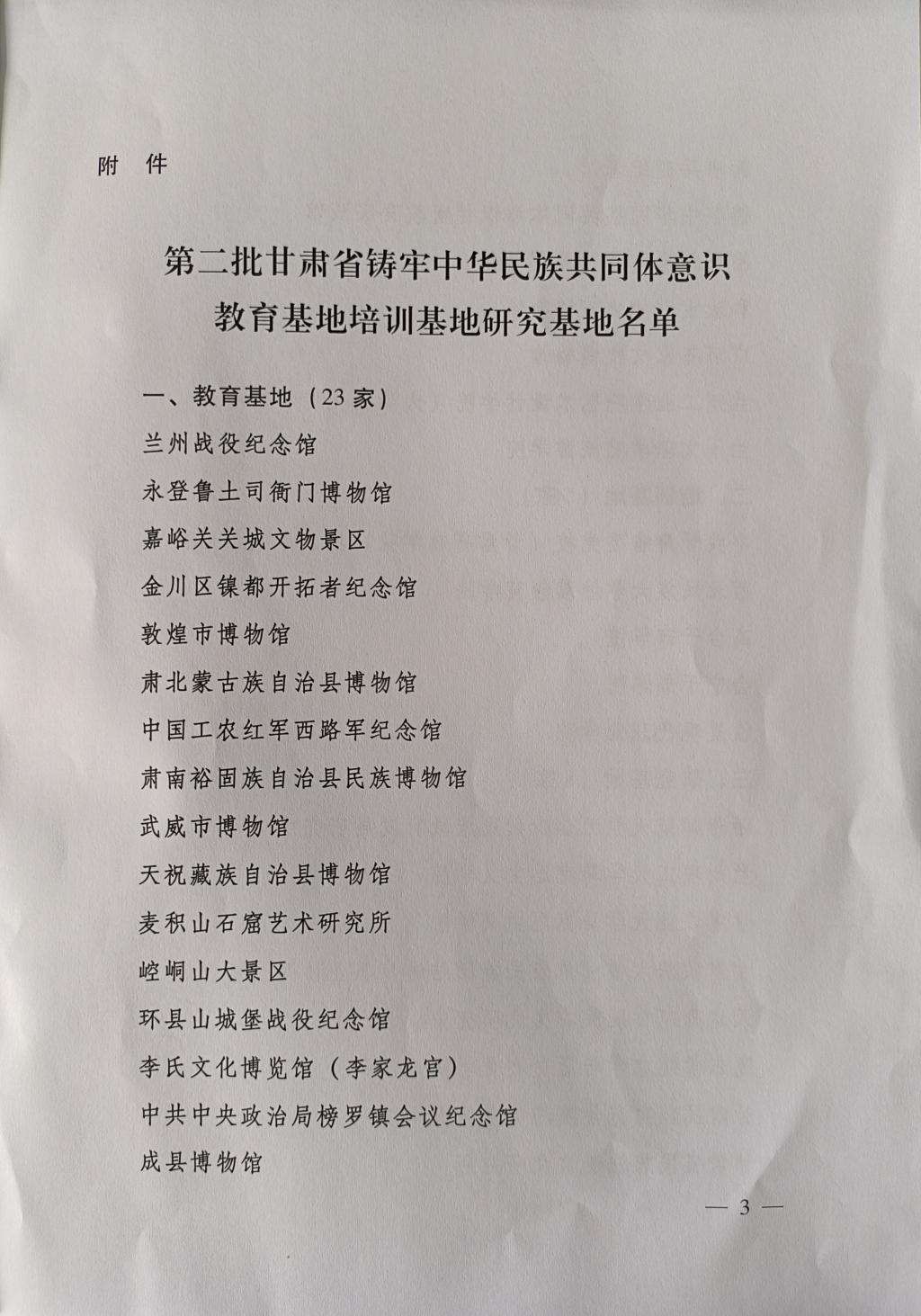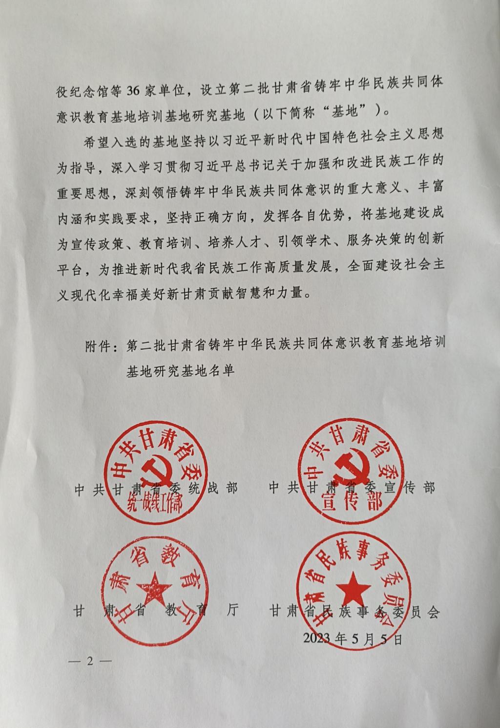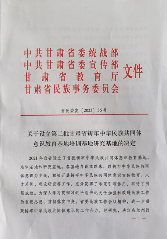 近日,甘肃省委统战部、省委宣传部、省教育厅、省民委印发《关于设立第二批甘肃省铸牢中华民族共同体意识教育基地培训基地研究基地的决定》,其中,beat365在线官网入口陇右文化研究中心获批为第二批甘肃省铸牢中华民族共同体意识研究基地。