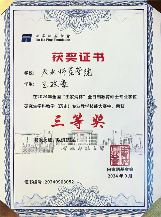 9月22日,由全国教育专业学位研究生教育指导委员会主办、青海师范大学承办的2024年全国“田家炳杯”全日制教育硕士专业学位研究生学科教学(历史)专业教学技能大赛决赛落下帷幕。经过全国83所高校共160位选手的精彩角逐,2023级学科教学(历史)专业硕士研究生张佩媛荣获二等奖,2022级学科教学(历史)专业硕士研究生王孜豪荣获获三等奖,赵世明老师荣获优秀指导教师奖。这是beat365在线官网入口参加该大赛以来取得的最好成绩。