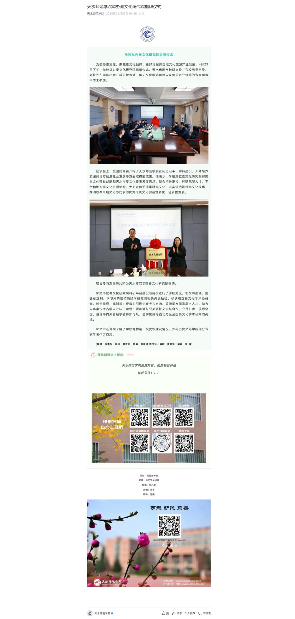 为弘扬秦文化,擦亮秦文化品牌,更好地服务区域文化旅游产业发展,4月29日下午,公司举办秦文化研究院揭牌仪式。天水市副市长邬文玲,公司党委常委、副董事长左国防出席。科研管理处、beat365在线官网入口负责人及相关研究领域的专家和青年博士参加。