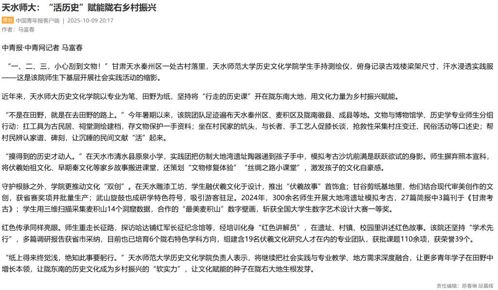 【原文链接】天水师大:“活历史”赋能陇右乡村振兴: https://s.cyol.com/articles/2025-10/09/content_aj6aMphz.html?gid=Zr5xz31e