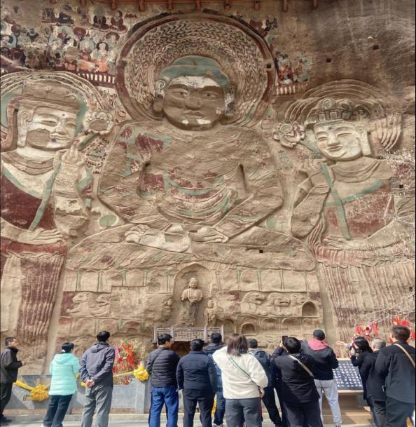 座谈会后,公司教师参观调研拉稍寺石窟。据拉稍寺题记,拉稍寺大佛开凿于公元559年,北周大将军尉迟迥为国运长久而建造大佛,愿天下和平、四海安乐、周祚与日月俱永。拉稍寺题记为后世了解大佛的开凿背景及建造者提供了有力证据。